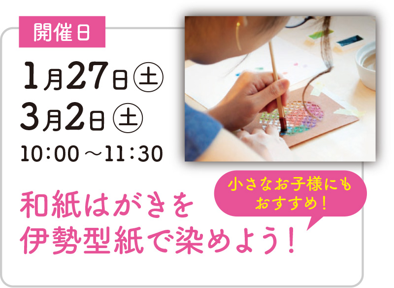 | 1月27日(土)・3月2日(土)10:00~11:30 | 西本願寺限定デザインの型紙で、和紙はがきの型染め体験 | https://select-type.com/ev/?ev=IZF-ys_yi6s |